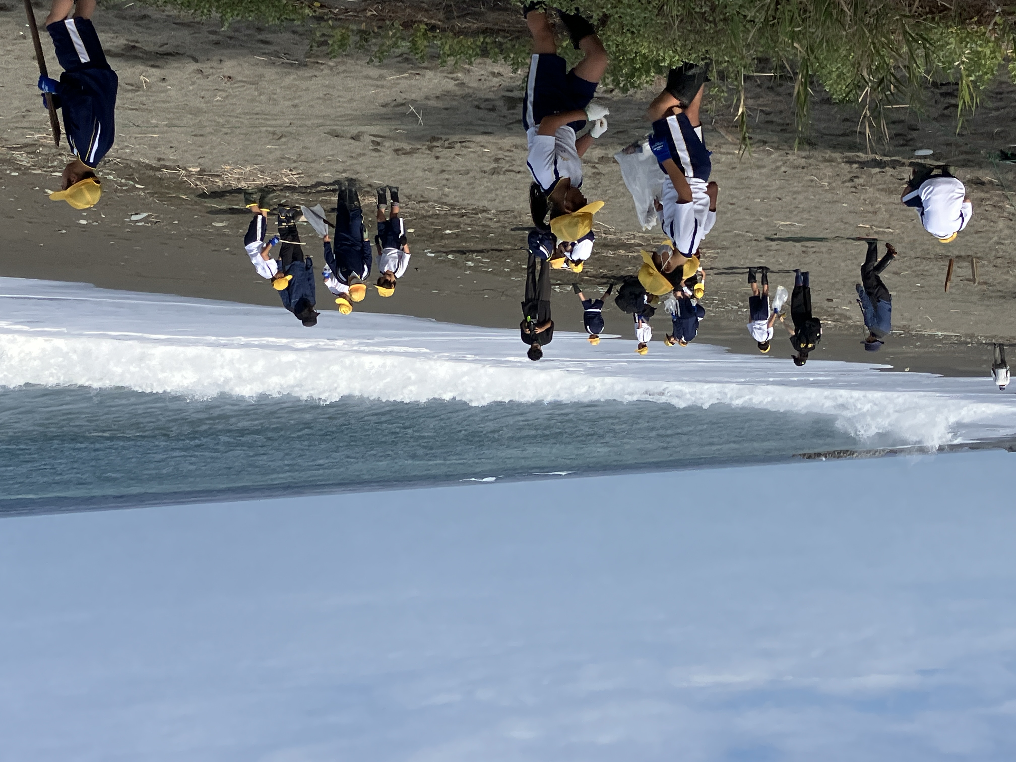 心配していた天気は、無事、晴れとなりましたが、 調査海岸に到着してみると、波が少々荒かったです。 児童たちの安全に十分に注意を払って調査を行いました。