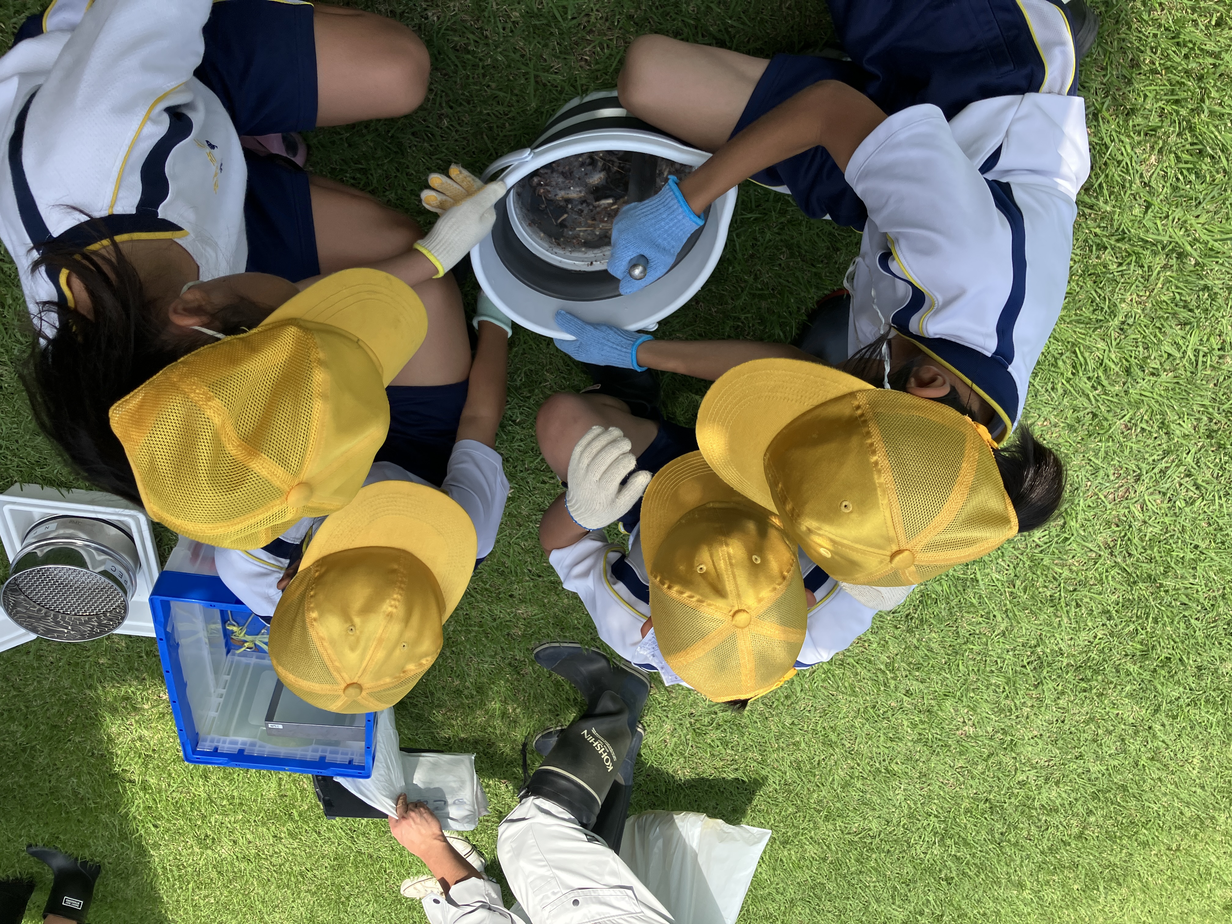 砂が湿っているので、バケツと水を使って、マイクロプラスチックを浮かせて取り出しました。